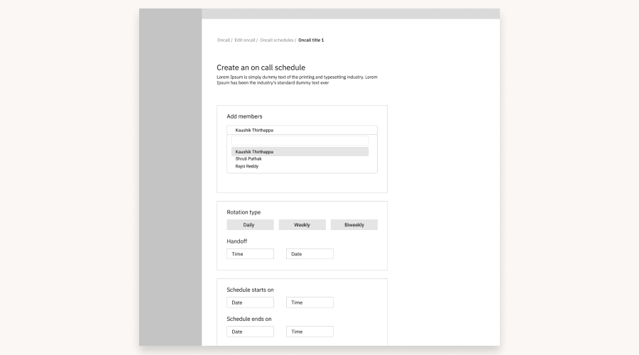 An on-call schedule ensures that the right person is always available to immediately respond to incidents. The MVP version of On-call would have just enough features to meet basic user needs like setting the rotation type and adding members. This would provide ample feedback for the future development of the on-call feature. After figuring out the basic needs, we came up with a simple user flow that involved the different prerequisites of an on-call schedule: choosing the on-call members, selecting the rotation type, and the starting date and time and ending date, and time). After deciding the user flow we worked on the wireframes