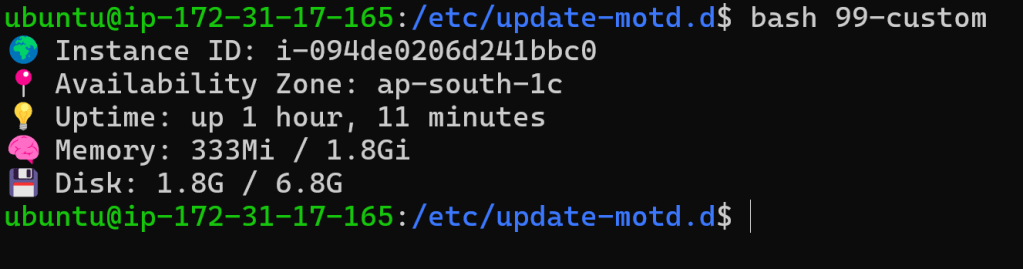 Today, in the age of cloud, MOTD has found a new role. It’s no longer just for messages, it’s a tiny dashboard, capable of showing system health, instance metadata, or even deployment info. Ubuntu, for example, takes it further with dynamic MOTDs that change every time you log in, generated by small scripts under /etc/update-motd.d/