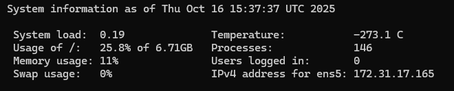 On Ubuntu cloud VMs, the default 50-landscape-sysinfo script prints system information, including a bogus -273.1°C because cloud instances don’t have access to real hardware sensors.